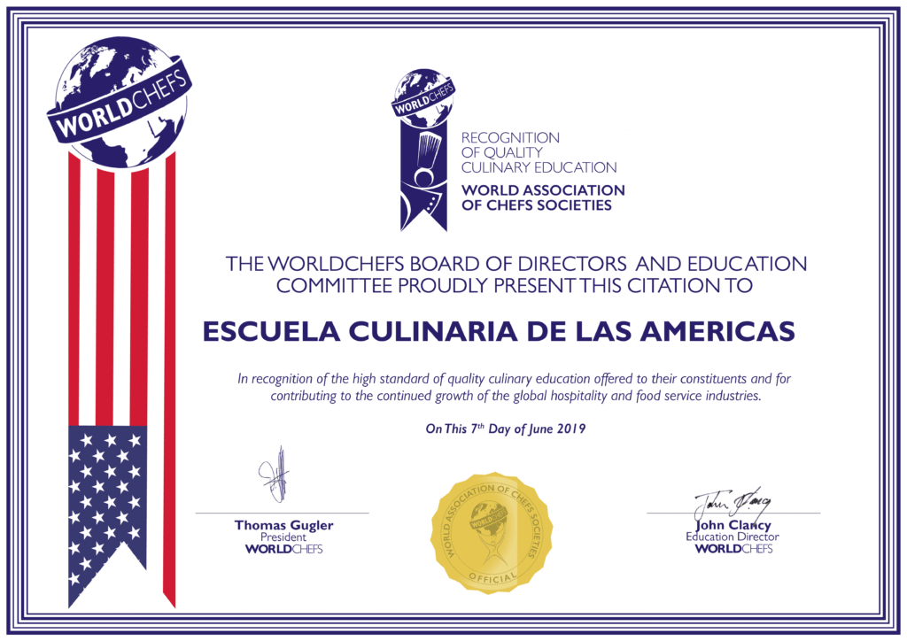 En reconocimiento del alto nivel de educación culinaria de calidad ofrecida a sus constituyentes y por contribuir al crecimiento continuo de la industria global de la hotelería y el servicio de alimentos.